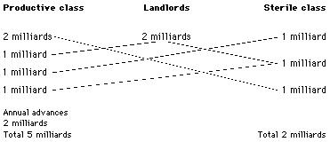 Marx gives two diagrammatic versions of the Tableau in his Theories of Surplus-Value, Part I, the first on p. 299 and the second on p. 367. The latter, a partially condensed version of that given by Quesnay in his Analyse, is reproduced here.