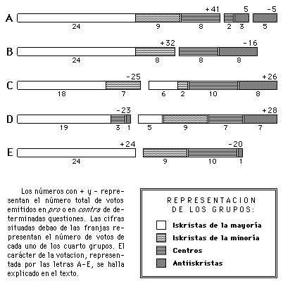 La organización de Iskra estuvo representada en el II Congreso del P.O.S.D.R. por 16 miembros, de los cuales 9 eran partidarios de la mayoría, con Lenin al frente y 7 eran partidarios de la minoría, con Mártov al frente.